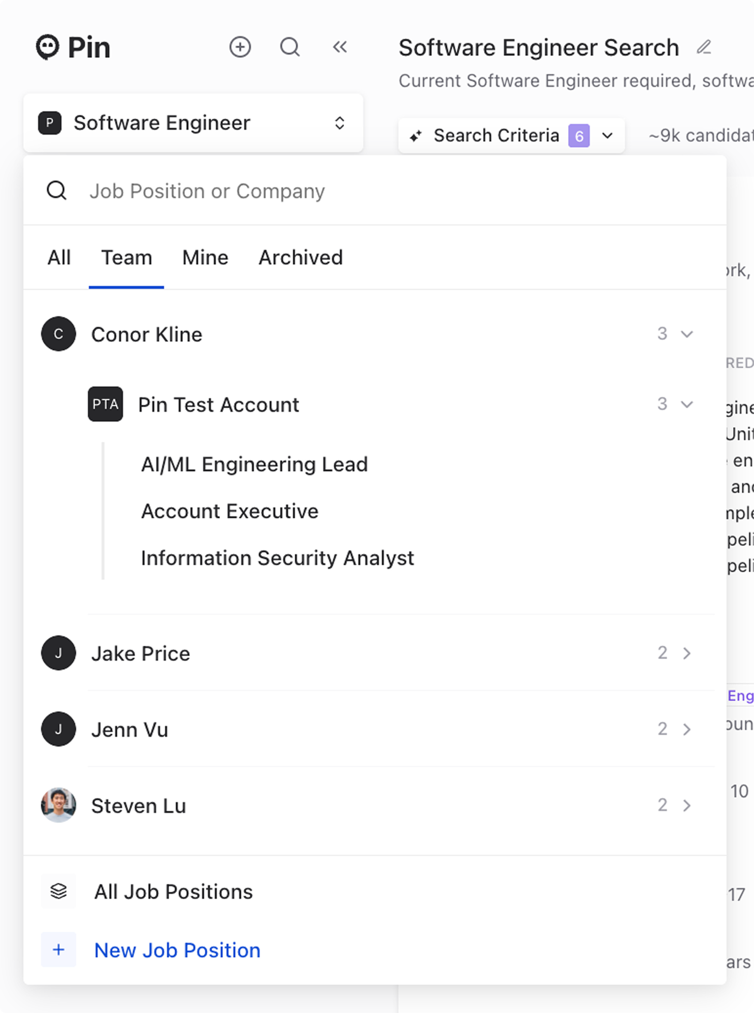 The Jobs dropdown menu has been redesigned for easier navigation and better job management. It’s now wider to display more information and includes a new "Team" tab for better visibility.