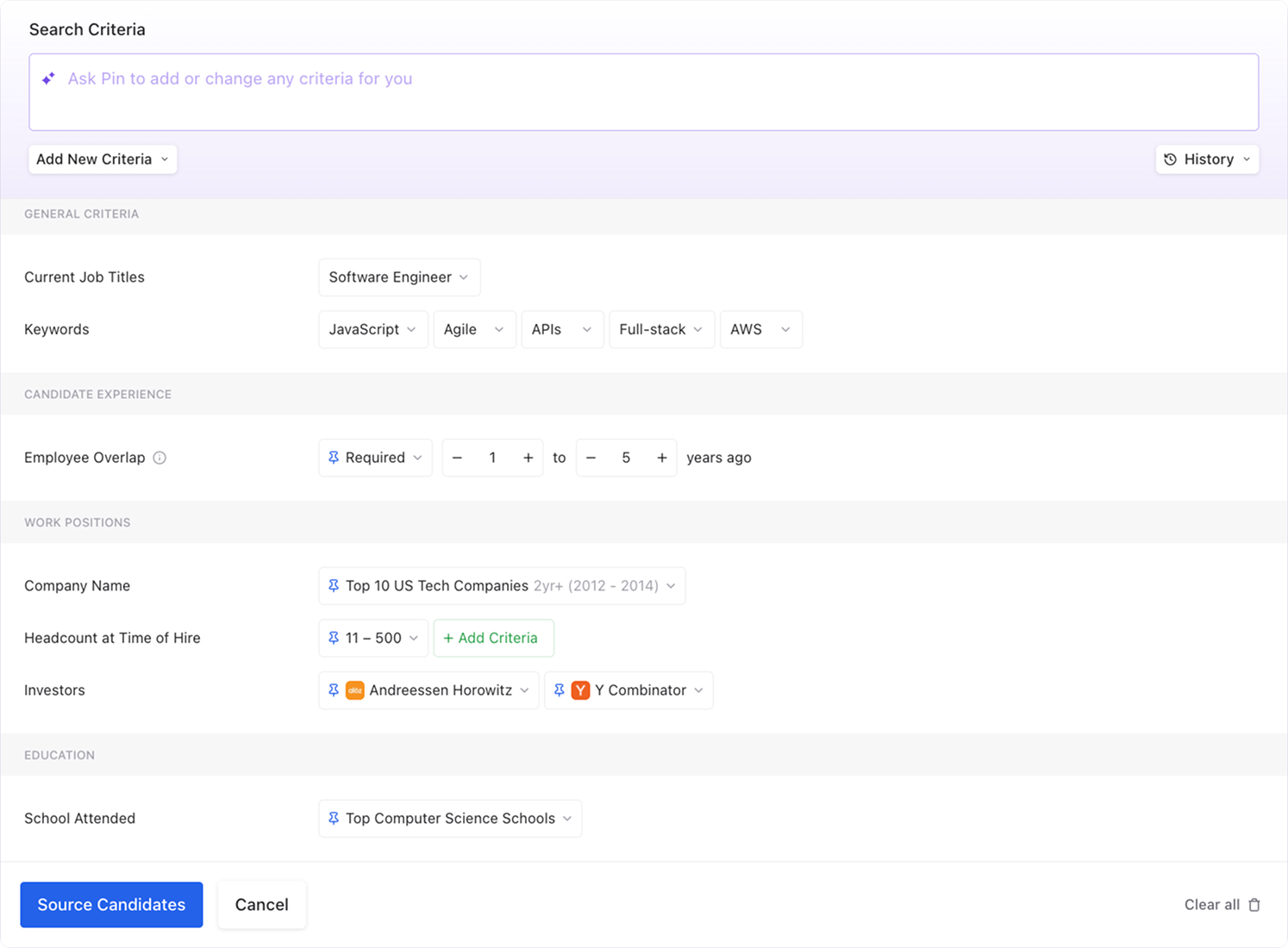 - Filter candidates based on the investors backing their current or past companies.