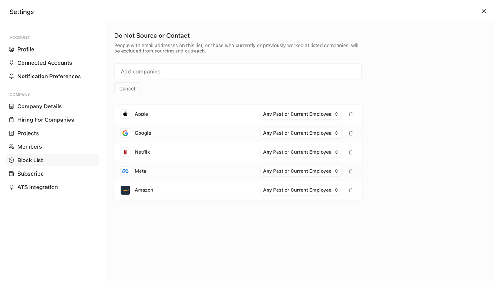 You can now easily copy and paste your unsubscribe lists and view all unsubscribed contacts in one place. Additionally, you can block specific companies across your entire organization to prevent them from appearing in sourcing results or being messaged.