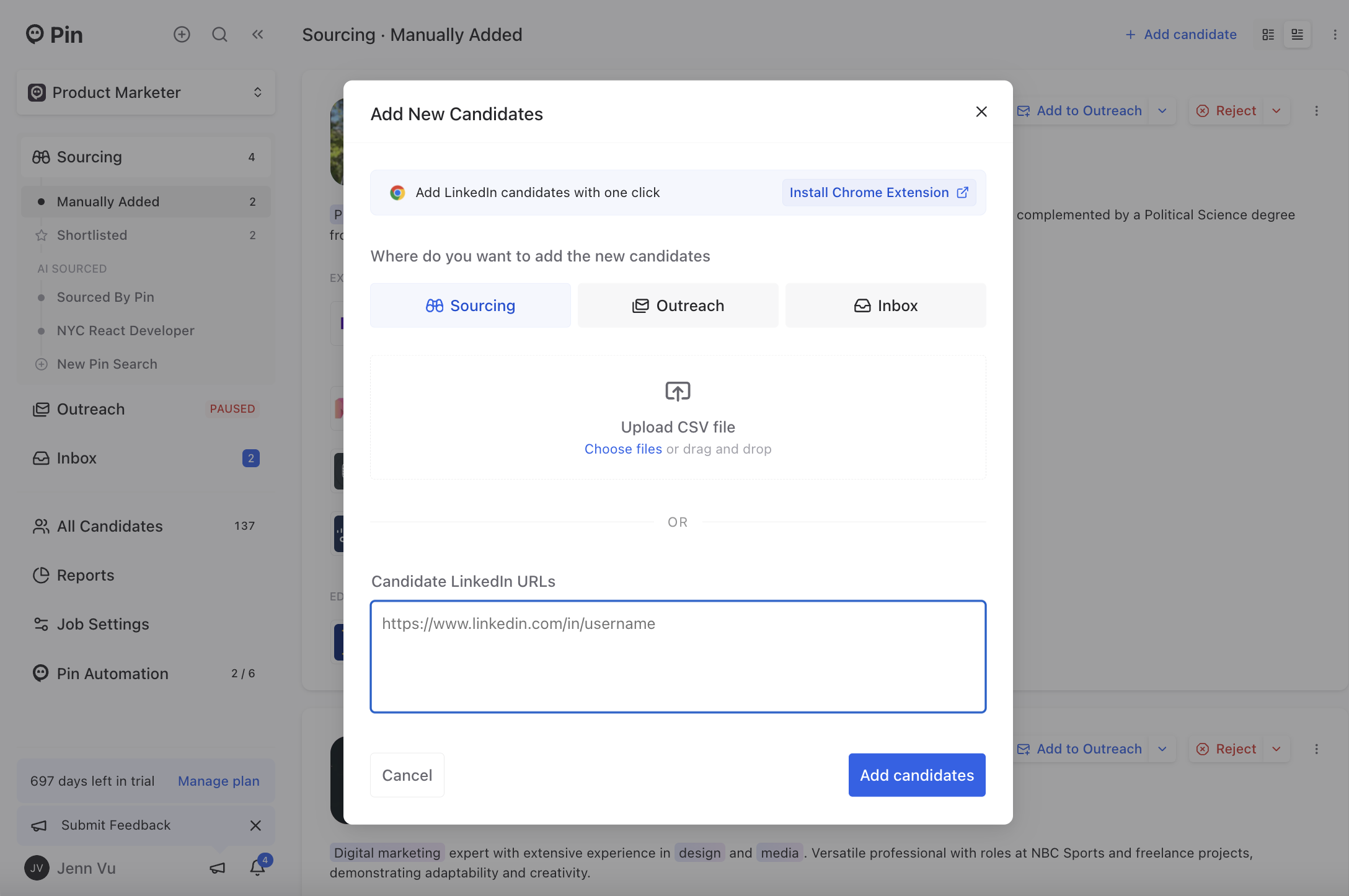 You can now import candidates into Pin via CSV files in the "Manually Added" tab of the Sourcing dashboard. To ensure a successful upload, include these three column titles: Full Name, Email, and LinkedIn URL.