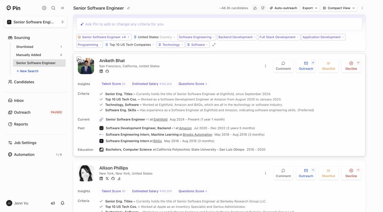- Bulk actions have been added to Shortlisted, allowing you to apply actions like “Add All to Outreach” or “Decline All” to all candidates at once.