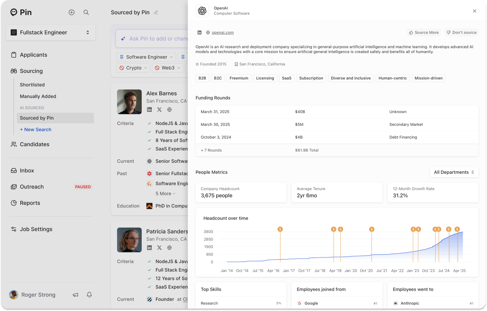 - Richer company context – Pin now understands more about each company, inferring who you’re hiring for to cut research time and surface more qualified candidates from a JD.