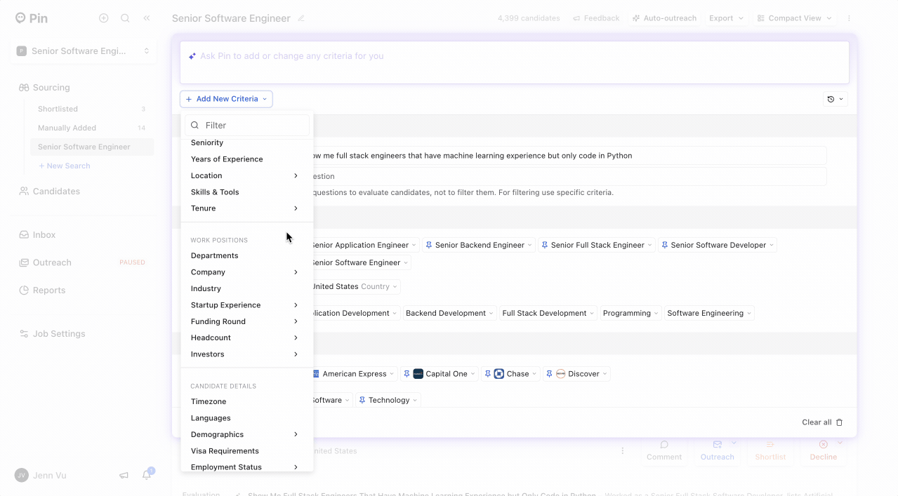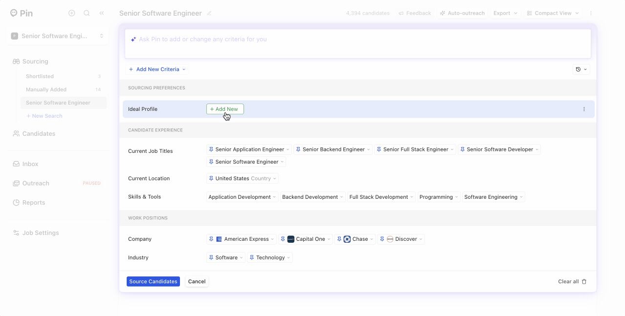 You can add specific LinkedIn profiles that match the type of candidates you’re looking for. Add as many as you’d like when creating a new job, using the “Ideal Profile” filter, or in the “Ask Pin” text box.
